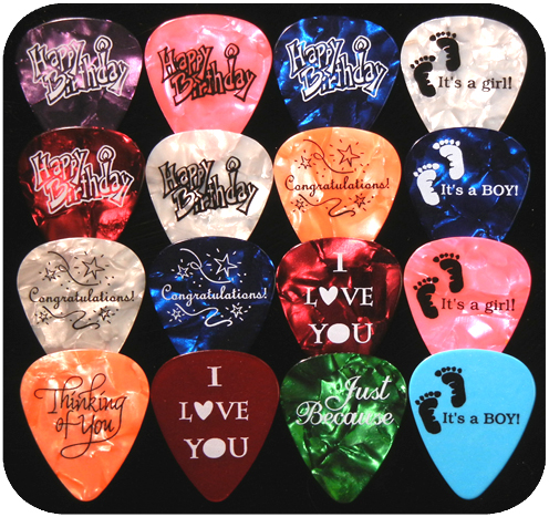 Pre-Printed guitar picks for that special occasion. Available in Medium gauge in the colors/Occasions shown. 12 identical picks per package. $3.50 BUY NOW